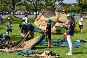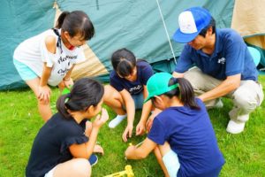 開校式のあと、自己紹介をお互いにして、当日宿泊するテントを組み立てました。初めて組み立てるというお子さんが多く、早くここで寝たいと言いながらテントを建てていたのが印象的でした。