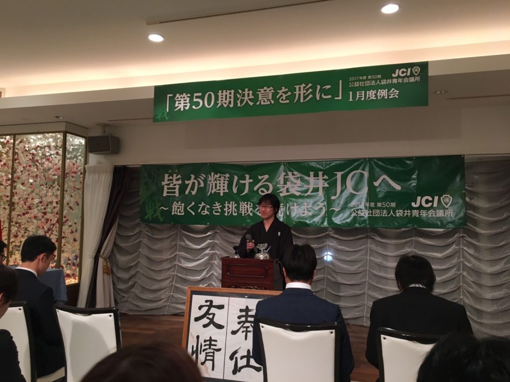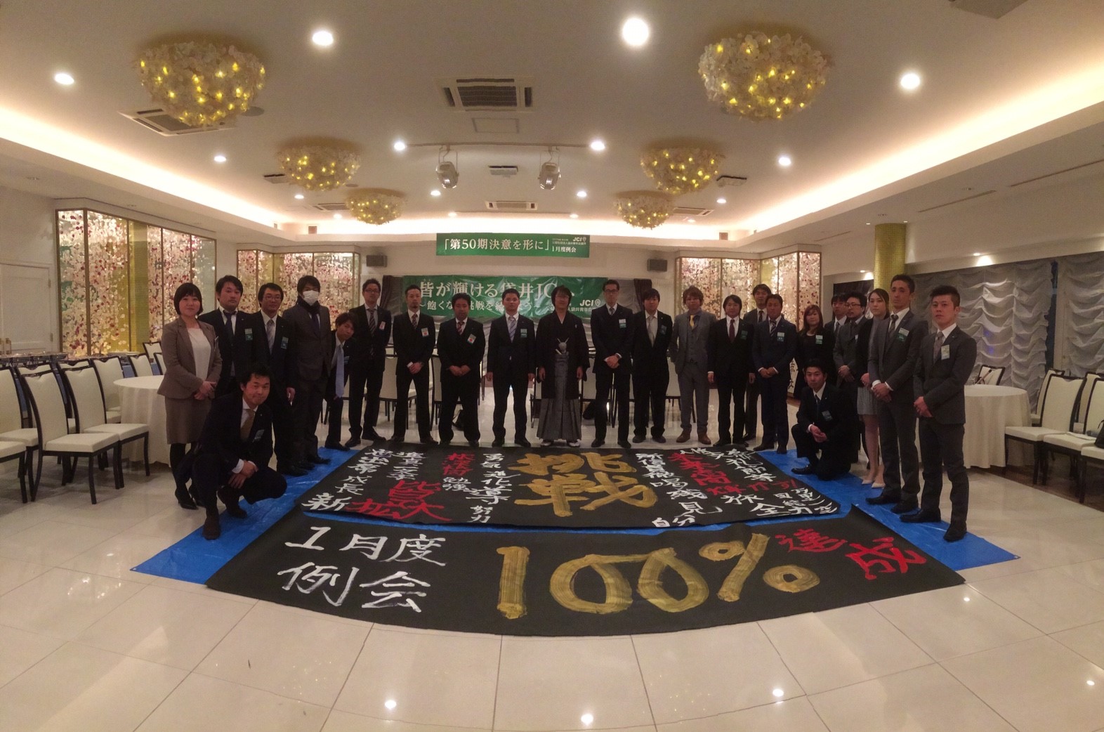 第50期の活動のスタートとして、2017年1月24日に1月度例会「第50期決意を形に」を開催しました。 メンバー全員で今年の目標を半紙に書き、決意を胸に本年度のスタートを切りました。 また100%例会も達成することができ、素晴らしい例会となりました。